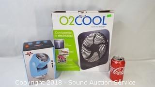 Both are in original boxes, appear to be new. 02Cool fan runs on batteries or wire.