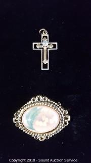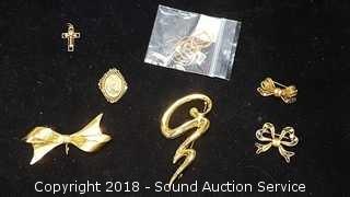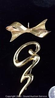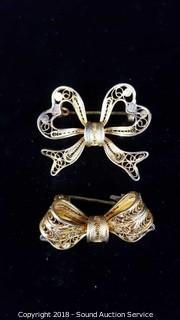 5pc. Vtg. Jewelry (Includes: 1/20 12K GF Bow Brooch (Marked 1/20 12K GF MK. Total weight: 6.7 grams. Approx. 2-1/2" x 1"), 1939 Camco Cameo of Roses Brooch, Small Cross Pendant w/Clear Stone (1"), Gold Tone Necklace w/Clear Stone Pendant, and 3" Gold Tone Swirl Brooch), 2 Vtg. Vermeil Filigree Bow Pins (Total weight: 6 grams. Marked "900". Approx. 1-1/4" x 1/2" and 1").