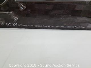 Includes: Tissue Holder, 2 Towel Bars, Double Robe Hook, and Towel Ring.