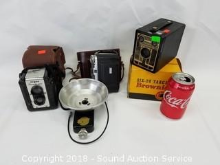 Includes: Target Brownie Six-Twenty w/Original Box, Balda Camera w/Leather Case, Argus Seventy Five Camera w/Leather Case, and Balda Flash.