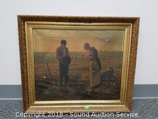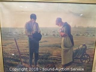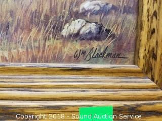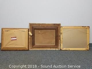 Nicely framed, 2 are solid wood frames (one is Texas oak). Print is by "W. M. Blackman". One print is in a wooden gold gilded frame, approx. 17" x 20-1/2". Has some damage on the print. One holds 14" x 18" piece of artwork.