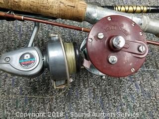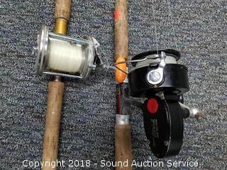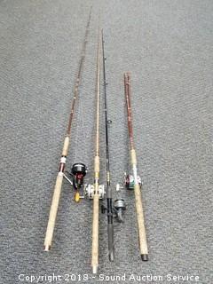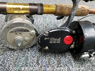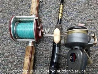 Includes: Vtg. Fenwick 8ft 10" Rod w/Penn 209 Reel (1-2.5oz Lure Weight, 15-30lb Line, Mooch Weight: 3-8oz), Wright McGill 8ft Granger Steelie #8480R Rod w/Kencore Drum 140M reel, 8ft Rod w/Mitchell Garcia 302 Saltwater Reel, and Wright McGill 6ft 7" Eagle claw Black Claw Rod (Line 8-20lb, Lure 1/2oz to 1-1/2oz) w/Daiwa Reel.