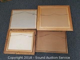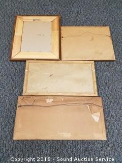 One is delft blue painted on glass. Two appear to be original watercolors, signed "Hams" and "B.M.B"? 5 are prints. Approx. 11" x 14" to 22" x 26".