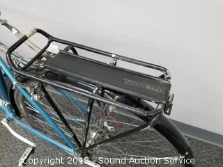 Comes with rear rack, front & rear fenders, cantilever brakes, gears shift. Front tire has a smaller valve, is low, don't have the right tool to pump it up.