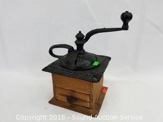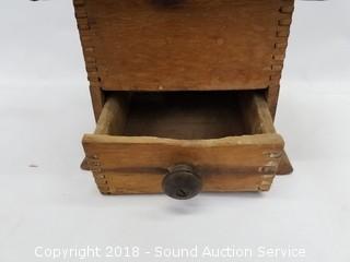 Coffee mill is dovetail construction, approx. 10" H, 6-1/2" square. Teapot is 10" H, 6" diameter.