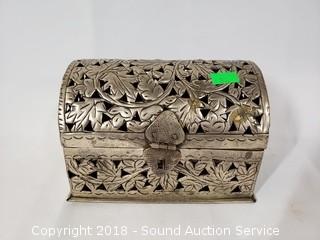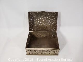 Trinket box is signed on the bottom "Gregorian Hand Hammered". Sign is 7" x 3", and Filigree Metal Trinket Box Made in India.