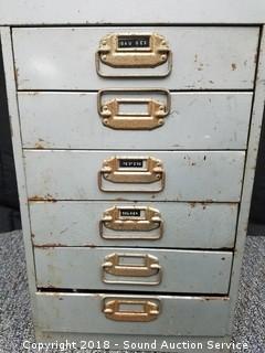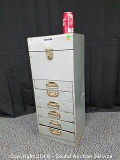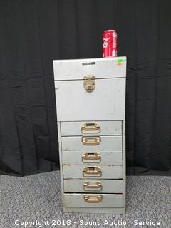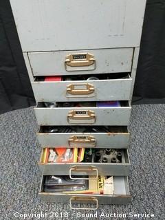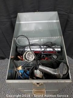 Includes: 4 Timing Lights, Compression Testers, Grand Prix Tachometer Dwell Meter w/Instruction Manual, Various Pressure Gauges, Gas Caps, Soldering Equipment, Distributor Equipment, and more. The cabinet has a metal file top with 6 drawers. Approx. 30" H, 12-1/2" W, 10" D.