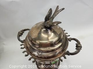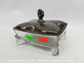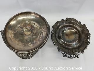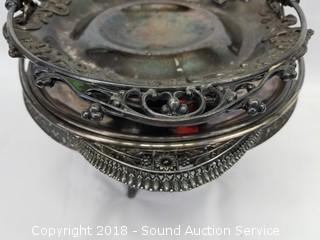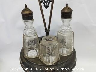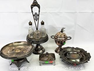 Includes: Covered Compote, Handled Compote Serving Trays, Covered Dish, and Cruet Stand w/Glass Bottles. Approx. 3" to 18-1/2" H.