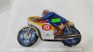 Snoopy alarm clock is 1958, winds up, works! Tin toy bike is Moto, looks to be missing a piece, made in Japan.