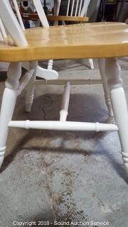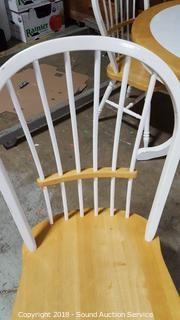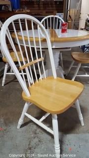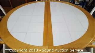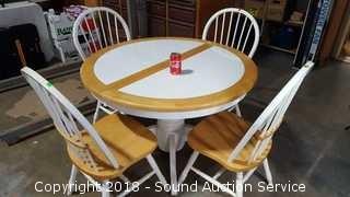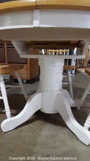 Round, white & oak finish. Has an internal leaf that folds out. Approx. 30" H x 42" Diameter with a 15' leaf. Some scoffs to the finish, mainly on the legs.