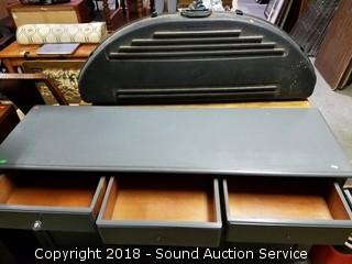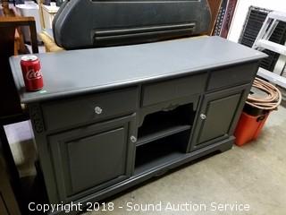 Has 3 drawers, one is missing the glass drawer pull, and 2 lower cabinets. Approx. 33-1/2" H, 59-1/2" W, 18" D.