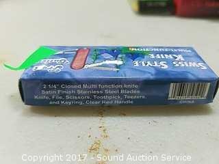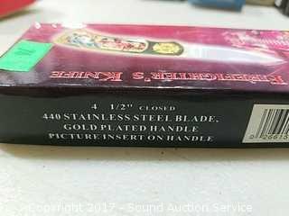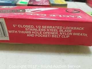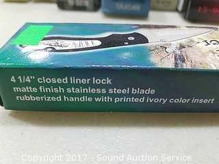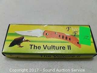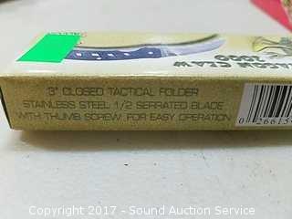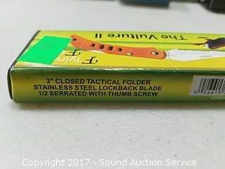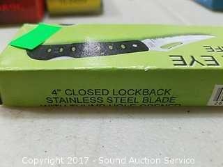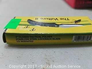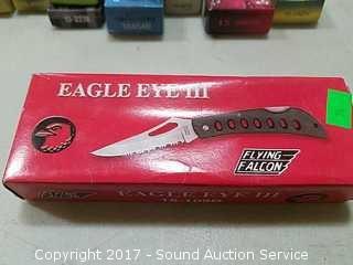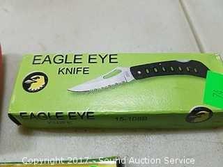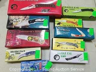 (2) Eagle Eye Knives, Eagle Eye III, Swiss Style Knife, Dragon Claw & (2) The Vulture II, Firefighter's Knife, The Warrior, & Wolf Folder. PLEASE REFER TO PHOTO'S FOR SPECS.