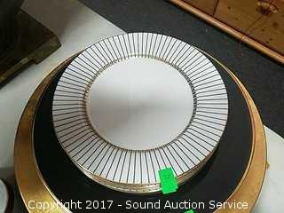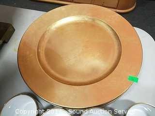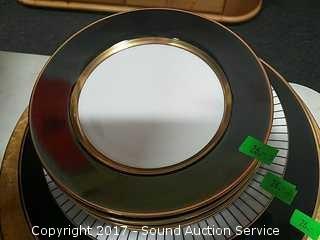 Includes: (4) cups, (4) saucers, (4) snack plates, (4) dinner plates, which are all renaissance pattern, and (4) Parallel pattern lunch plates, and (4) gold chargers. Very high end elegant set.