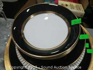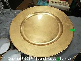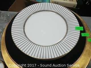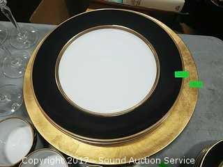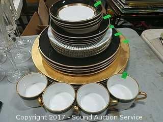 Includes: (4) cups, (4) saucers, (4) snack plates, (4) dinner plates, which are all renaissance pattern, and (4) Parallel pattern lunch plates, and (4) gold chargers. Very high end elegant set.