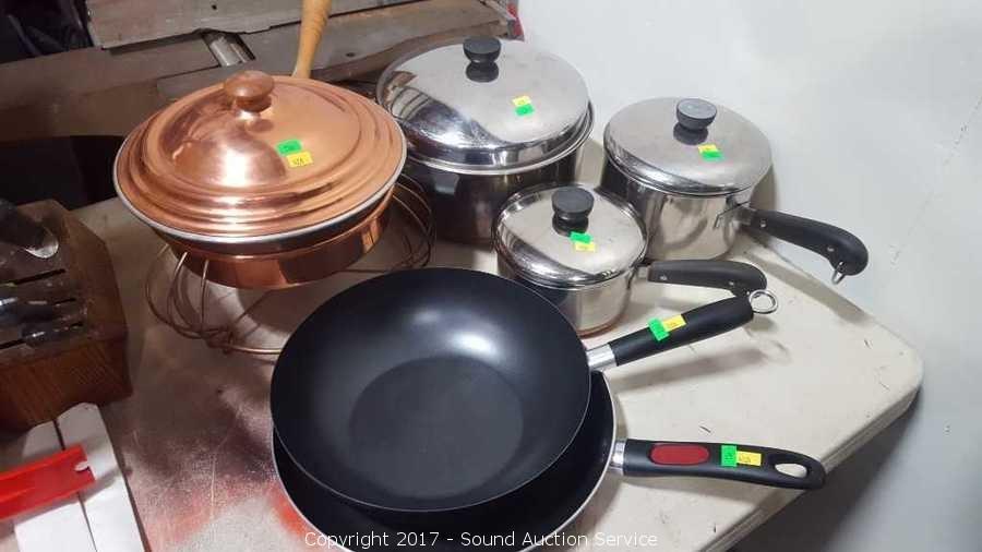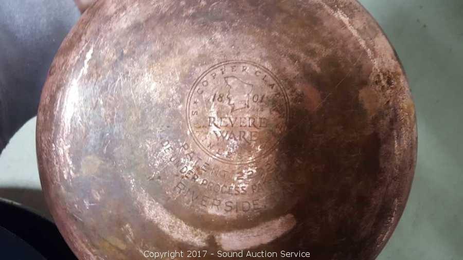 Includes 3 Revere Ware pots, copper chafing dish and two other pans.