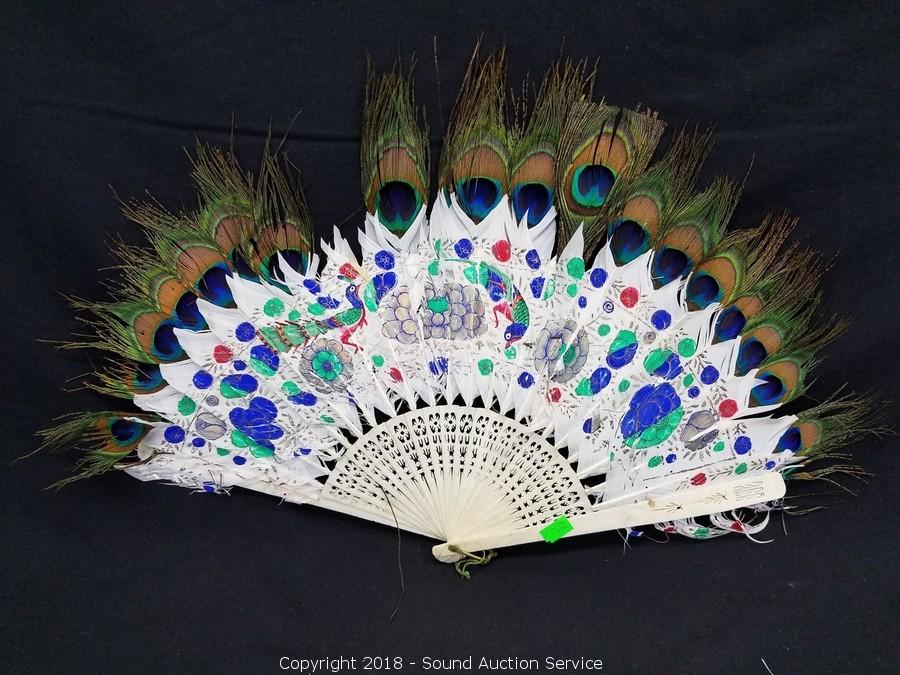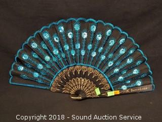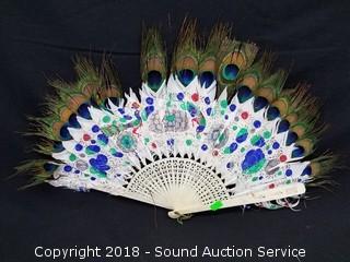 One is marked "Barcelona". 2 are adorned with sequins, one is carved from bone and peacock feather, hand painted, one of the eyes of the peacock feather has come free, still present.