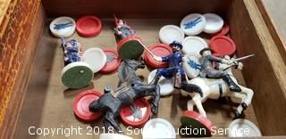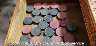 Has different game boards designed into the top, has 3 drawers, comes with game pieces, unsure if all are there, unique textured finish. Approx. 16-1/2" H, 34-1/2" W, 22-1/2" D.