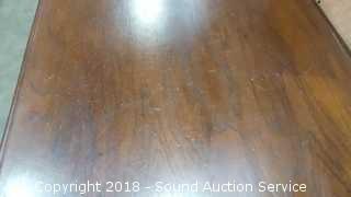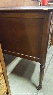 Brass hardware, wooden casters (missing one), 4 dovetail construction drawers. Has some white paint specks on the top. Approx. 31" H, 41-1/2" W, 19-1/2" D.