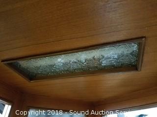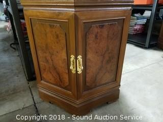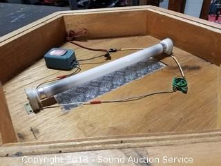 Bulb possibly needs replaced, takes a 12" fluorescent tube. Has 3 adjustable glass shelves. Approx. 70" H, 21" diameter. Has a Birdseye maple veneer.