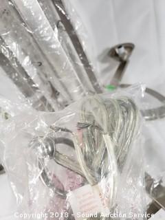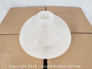 Looks to be brand new, still in original plastic and boxes. May be missing the bolt that holds the larger shade in place. Has frosty white glass shades. Holds 9 bulbs. Approx. 25" L, 27" diameter.