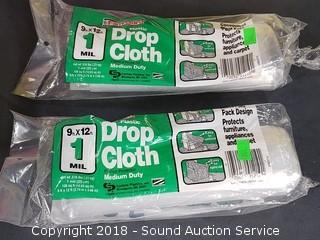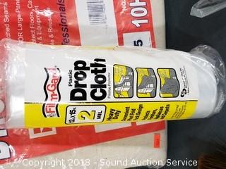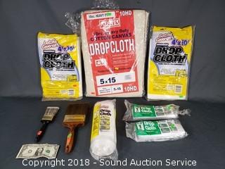 Includes: (2) 5ft x 15ft Cotton Drop Cloths, (2) 4ft x 10ft Absorbent Drop Cloths, 12ft x 15ft Plastic Drop Cloths, (2) 9ft x 12ft Drop Cloths, and 2" and 4" Paint Brushes.