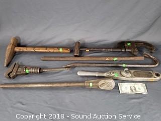 This auction is consists of a mixed variety of estate items. Includes: Vtg. Cast Iron Enamelware Stove, Norwegian Ice Axe, Drop Front Secretaries, Suit Butlers, Hutches, Guitars, Sewing Fabrics, Fransicanware, Silverplate, Yard Art, Yard Tools, Fountains, Vtg. Tools & Toolboxes, Mid-Century Clocks, Accuquilt Go! Cutter & Dies, Utility Cabinets, Firepit, Whirlpool Washer & Much More!