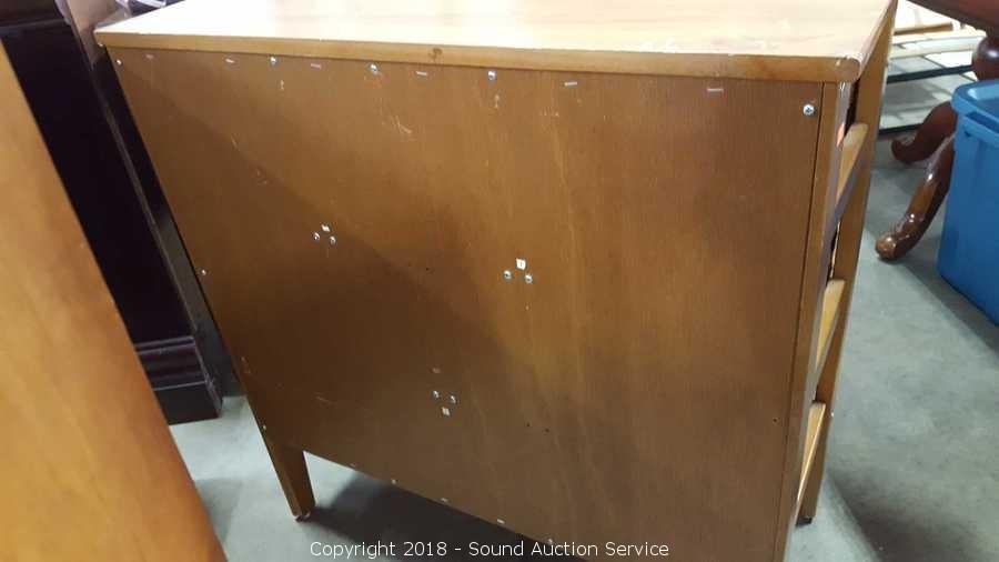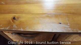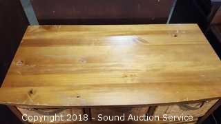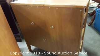 Drawers are wood lined, leather handles. Some scratching on the top. Approx. 33" H, 32" W, 16-1/2" D.