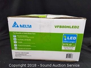 Model VFB80HLED2. 80 CFM air movement, 0.8 Sones sound level, dimmable, 13 watt LED light, 850 lumens, 2700k soft white color. Appears to be NIB.