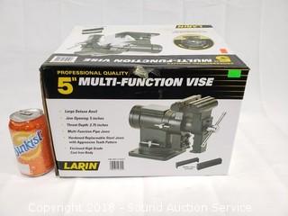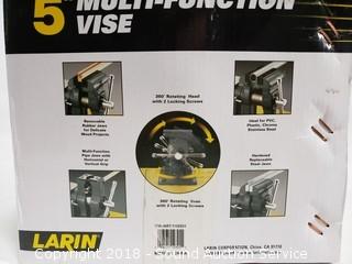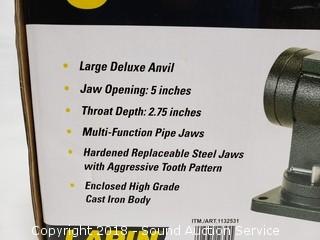Professional quality. Features large anvil, 5" opening, multi-function pipe jaws, replaceable steel jaws, cast iron body, and rubber jaws.