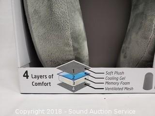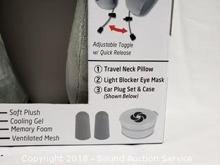 Includes: Neck Pillow, Light Blocker Eye Mask, and Ear Plug Set. Silver/grey color.