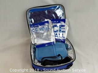 Comes with bento container and 2 ice walls. Approx. 10" x 8" x 4". The pull on the main zipper is missing.