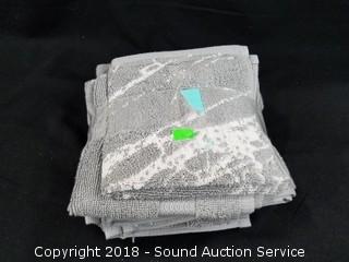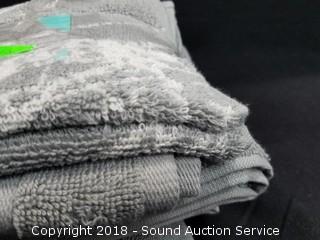 2 wash cloths, 2 hand towels. White and grey print.