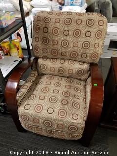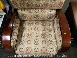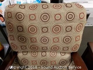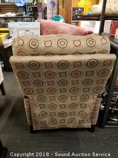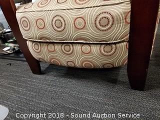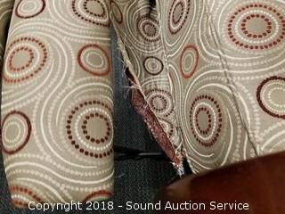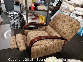 Circle print. Approx. 29" W, 39" high overall. Inside fabric of the footrest is torn.