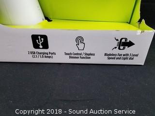 2 USB charging ports, touch control, bladeless fan with 3 speed levels. Comes in original packaging.
