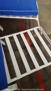 Metal base, vinyl slats. Approx. 80" L, 24" W. Pads are 3" thick. Table is approx. 17" H, 16" diameter.