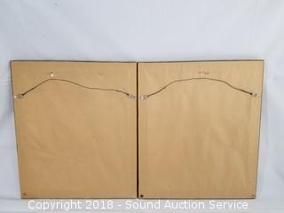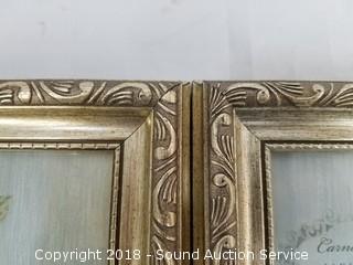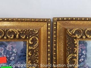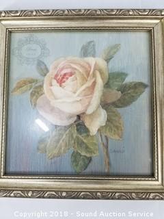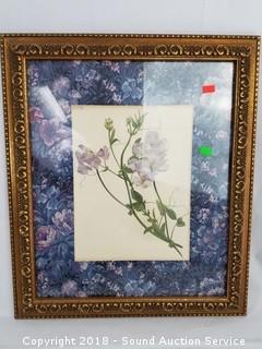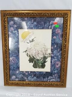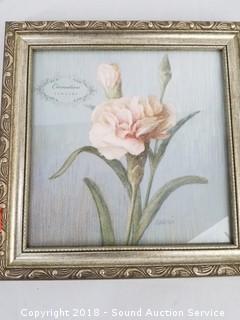 The gold ones are Chrysanthemum and Sweet Pea prints. The silver ones are Carnation and Rose. Framed and matted with glass. Overall approx. 20" x 17-1/2" and 10" x 10".