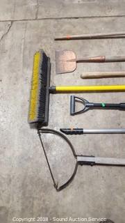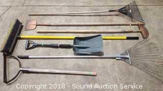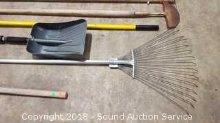 Includes: Adjustable length snow shovel, Adjustable leaf rake, push broom, sickle, another leaf rake, edger & scraper.