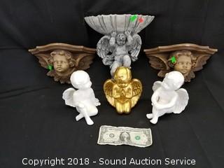 Lot #0231: Ceramic Angel Wall Sconces, Wall Pocket & Statues
