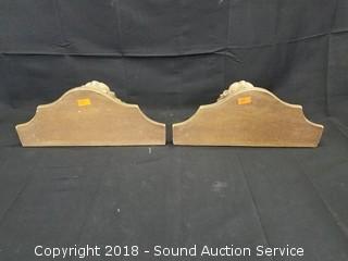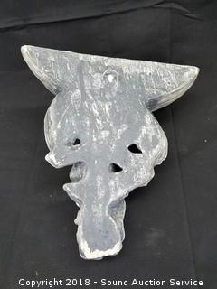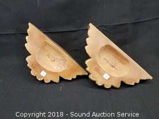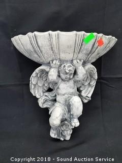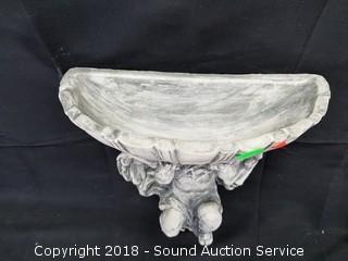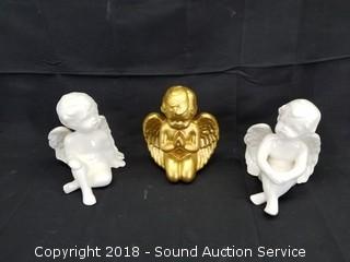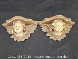 Includes: 11" x 5-1/2" Floating Shelves, Wall Mount Angel Holding Dish and 3 Angel Statues, One Painted Gold. The bottom of one of the statues is cracked.