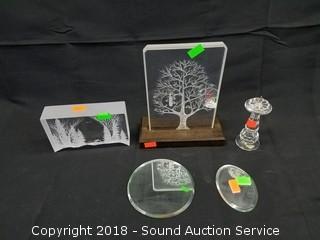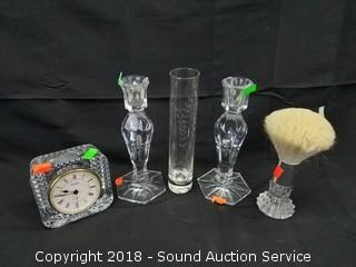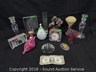Includes: Gemstone Adorned Bonsai Tree Decor, Crystal Bud Vase, Crystal Candlestick Holders, Crystal Clock, Etched Acrylic Paperweights, Hand Blown Art Glass Oil Candle, Powder Brush, and Hand Blown Shell Decor.