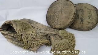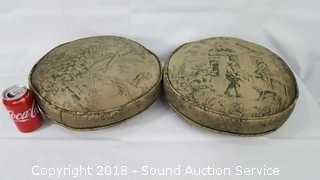 A Victorian style scene print, all match. Pillows are down fill. Approx. 14" diameter. Coverlet is approx. 100" diameter.