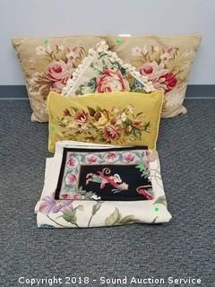 Lot #0190: Lg. Lot of Needlepoint Pillows & Table Runners