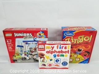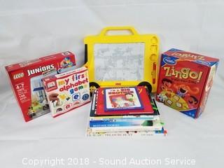 Includes: Sealed Juniors Lego Set, Zingo, and Various Books (Refer to photos for titles).