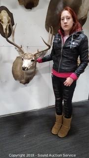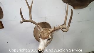 Approx. 19" wide antler spread. Largest antler circumference near the bur: 7". Main beam length: 19-1/2" L. Largest normal point is 10" long. Abnormal points: 4-1/4". Overall 40" tall, 22" wide and extends 30" from the wall.