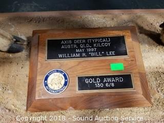 Gold Award of May 1997 by William Lee, Comes with award plaque. Approx 26'' long horns, 17'' horn span, 5.5'' largest circumference. Overall 66'' tall, 51'' wide & 23'' deep.