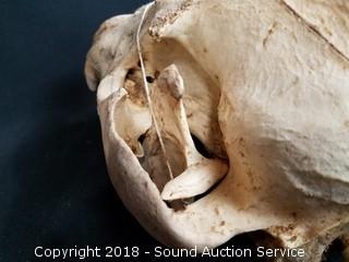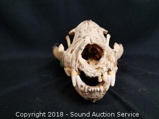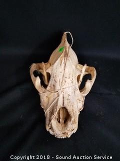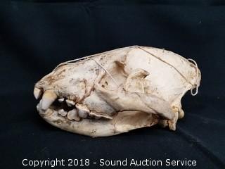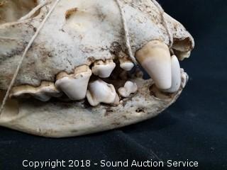 The k-9 teeth are 1-1\4'' long. The skull is 11'' long and 6-1\2'' wide. Stands approx. 5'' tall.