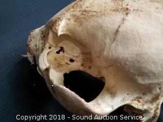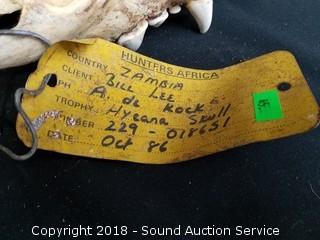 Skull is overall 10-1\2'' long, 6'' wide, 4-1\2'' tall. Jaw bones are 7'' long. Comes with some loose teeth. Metal Hunters of Africa tag from Zambia 1986.
