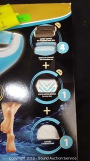 Includes: Rechargeable Foot File, Charging Dock (Missing the wall adaptor), 2 Ultra Coarse Heads, 2 Regular Coarse Heads, Exfoliating Brush, and Storage Bag.