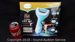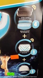 Comes in original box, complete. Includes: Rechargeable foot file, charging dock, ultra coarse brushes, regular coarse brushes, exfoliating brush, and storage bag.