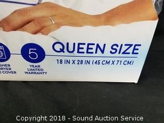 Looks to be new, in original packaging. Queen size 18" x 28".